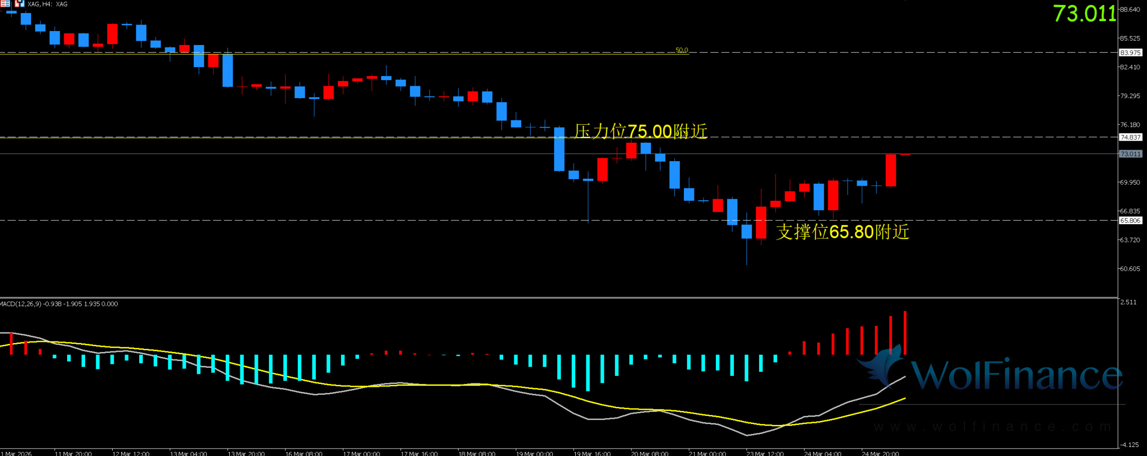 白银 4 小时级别图表显示,价格在 73.0 附近震荡,上方 75.00 压力位明显,反弹至该区域易承压回落;