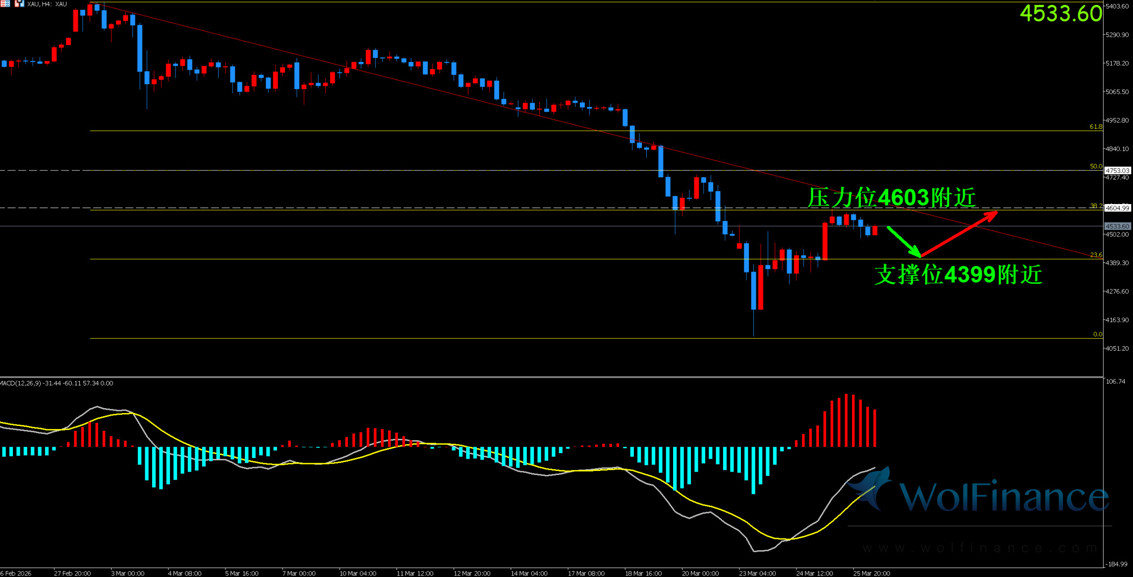 压力位:4600 附近(前期反弹高点 + 日线阻力带)