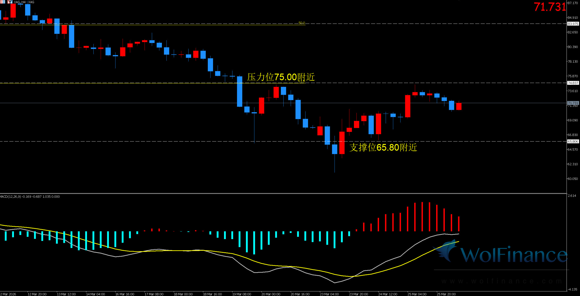 周四(03 月 26 日)白银早盘震荡回落,当前价格报 71.731 附近,核心源于工业需求预期边际走弱,叠加美元指数高位波动,银价反弹动力不足,整体维持弱势震荡。