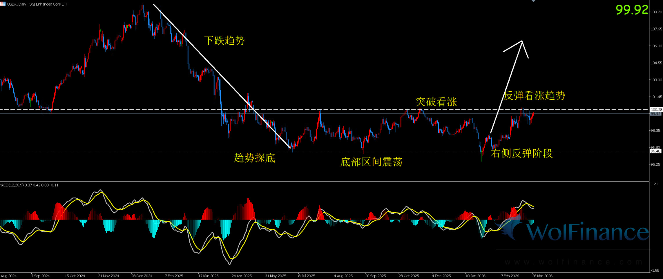 图表显示目前美指为高位震荡偏强行情,受美联储鹰派指引与美国经济数据支撑,美指站稳 105.5 关口,对黄金形成持续计价压制与资金分流压力,限制金价反弹空间。