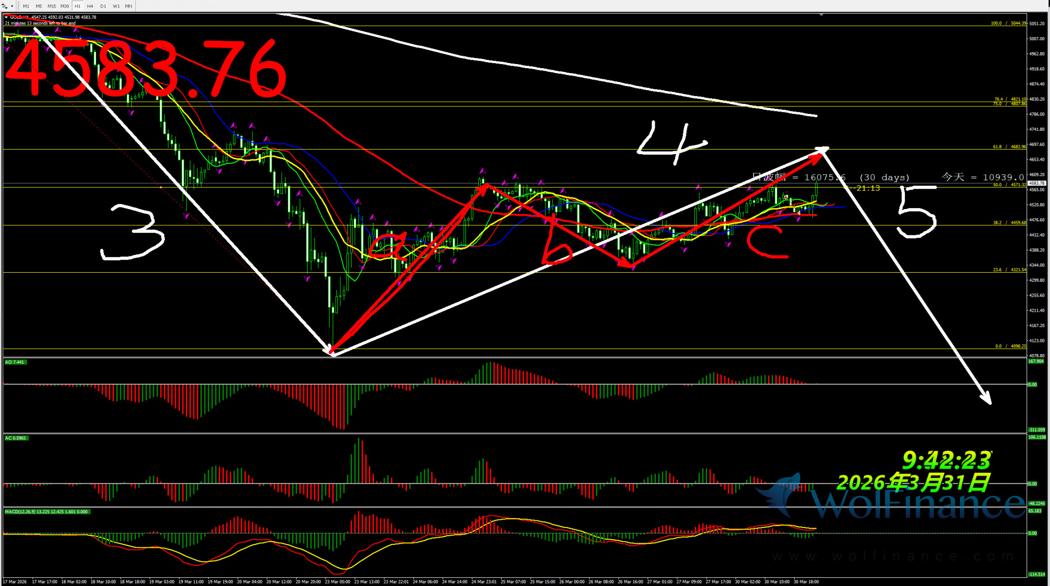 日线级别行情处于4浪行情,关注4浪行情走势,在日线图中关注压力倾向在日线图5100一线附近;支撑倾向在日线图50%(4743);61.8%(4541);四小时行情处于4浪状态,关注4浪的行情走势。支撑倾向在4100附近。1小时图AO零轴上绿色,AC零轴下绿色,代表在小时图中,行情倾向隔夜小时图处在4浪行情,目前在小时图中关注4浪的行情走势,下方支撑4100附近。在1小时图中,行情上涨压力关注5100附近。