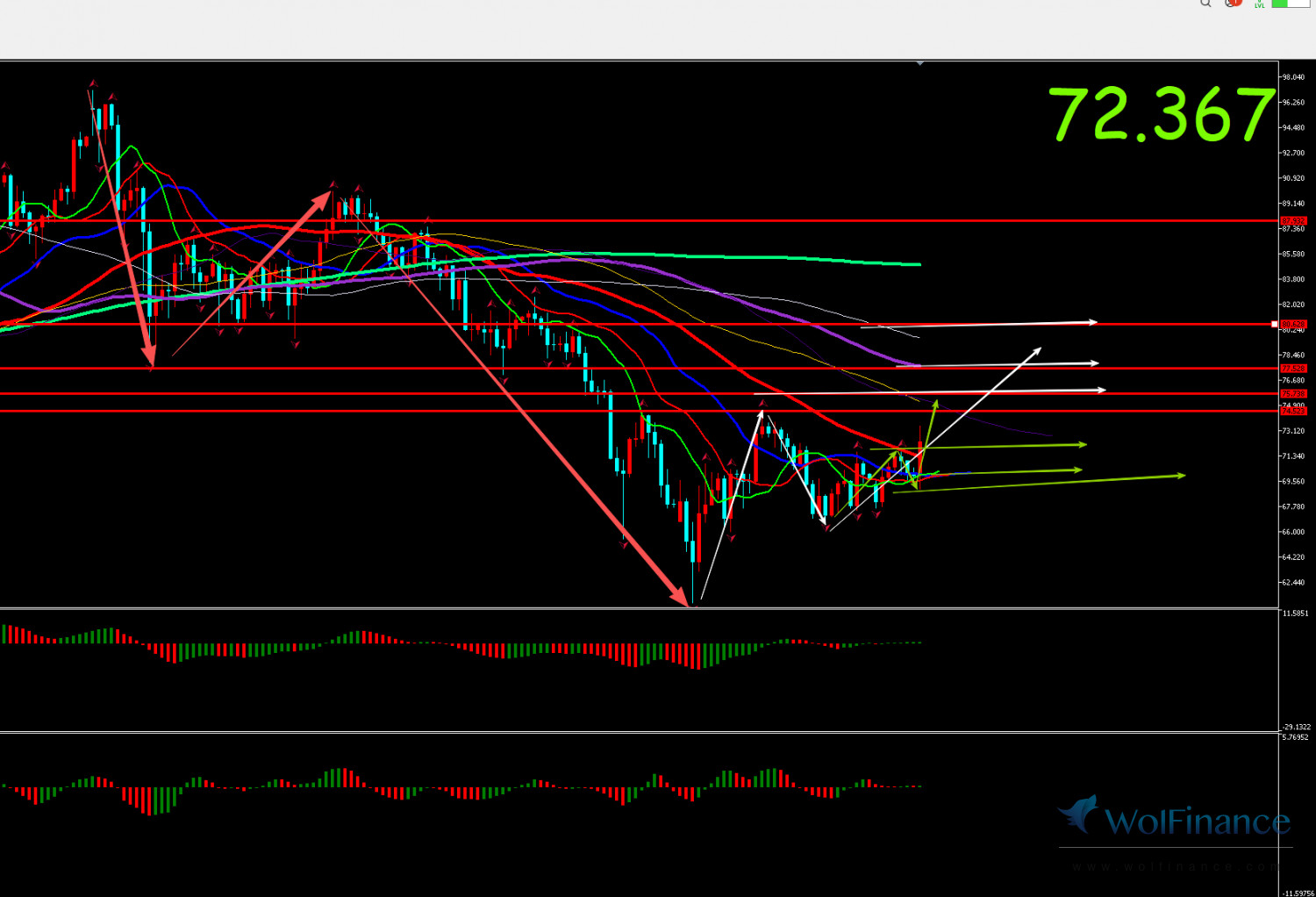 1. 激进者在附近75.66-77.15试空,稳健者79.67-81.22空,止损自带1.3美金,目标:超过2美金后移动保本损,之后尝试持有1-2美金波动择机出场.