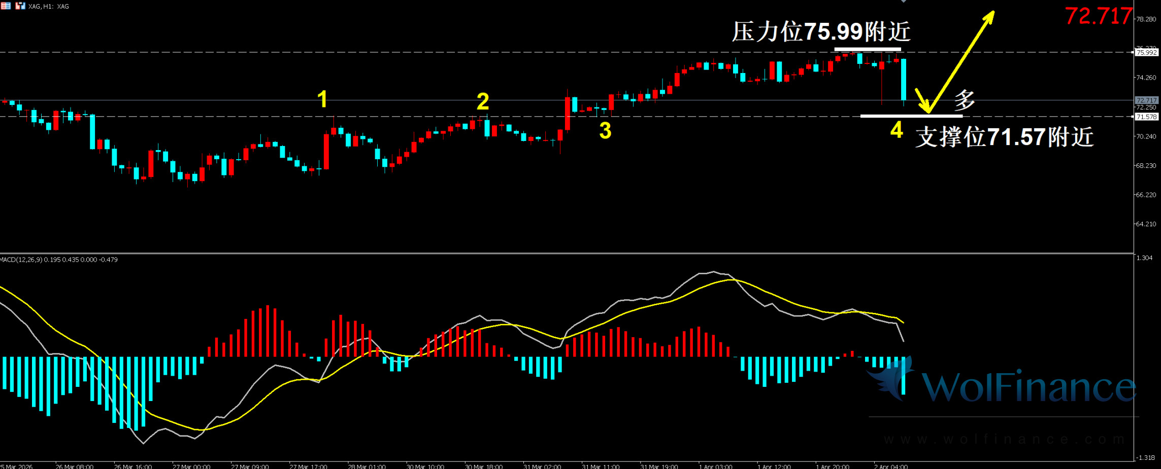 白银 1 小时技术图表显示当前价格处于快速回调阶段,下方 71.57 附近为关键支撑,企稳概率较高;
