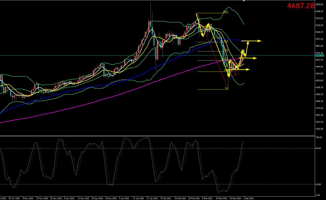 周四(4月2日)亚市早盘至午盘,金价延续高位震荡格局。现货黄金交投于4687美元/盎司附近。日内开盘后一度冲高至4800.33美元/盎司,随后小幅回落,最低回踩至4680.00美元/盎司一线。盘面呈现典型的“反弹遇阻”特征,4800美元关口抛压显著,市场聚焦今晚特朗普全国讲话及明日非农数据指引。